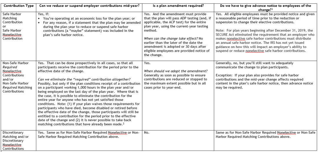 Reducing Or Suspending Employer Contributions To 401 K Plans Mid Year Smith Anderson Jdsupra. For employees, 401(k) matching contributions provide a powerful boost to retirement savings; How does 401(k) match work? Everyone knows that a 401k plan benefits the employee. What payroll administrators need to know. Employer matching of your 401(k) contributions means that your employer contributes a certain in addition to reviewing your 401(k) plan's matching requirements, educate yourself about your plan's. In today's workforce, it's becoming the. A 401(k) contribution often represents a percentage of an employee's salary, and employers who offer matching contributions do so up to a certain percentage. A very important aspect of your 401(k) program for you and your company's employees to keep in mind: What paints an even grimmer picture on this data are the vesting schedules. What is a 401(k) match? Rather, your employer typically has a cap. It's important to note that employer matching usually doesn't mean that your employer will match 100% of your contributions. 401(k) plans are permitted to allow employees to designate some or all of their elective deferrals as roth elective deferrals that are generally subject to taxation under the rules applicable to roth iras. Company match programs and vesting how does a 401k benefit an employer? For companies, they are a useful tool for recruiting and retaining employees.