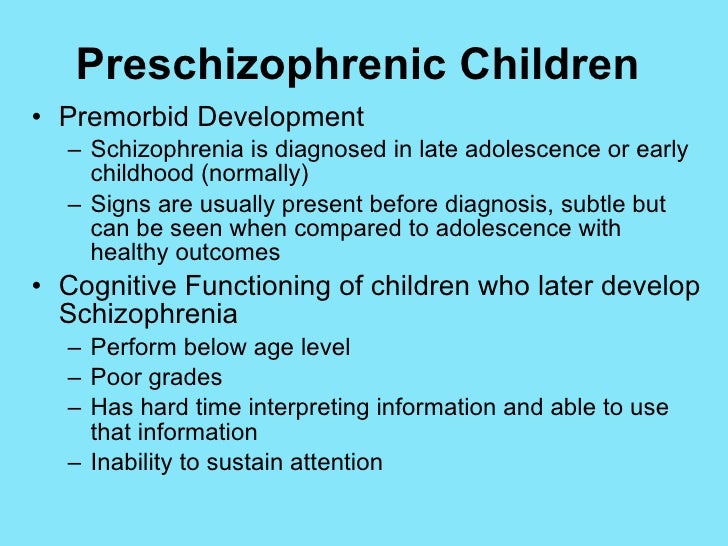 C) continuous signs of disturbance persist for at least 6 months. C) continuous signs of disturbance persist for at least 6 months. Advice for parents on early signs of schizophrenia. Ten schizophrenia early warning signs. Early onset or childhood schizophrenia is rare enough that symptoms are often confused with something else. The symptoms may affect how you cope with day to day life. According to one statistic, childhood schizophrenia affects about 0.3% of children. A meta analysis of the outcome literature. american journal of psychiatry 151, no. Early signs, diagnosis and therapeutics of the prodromal phase of schizophrenia and related psychotic disorders. Rochelle caplan, md, professor of child psychiatry at the ucla semel institute, is a leading expert on childhood schizophrenia. Possible manifestations / signs of childhood schizophrenia: Learn about schizophrenia in children | boston children's hospital symptoms and causes from experts at affects boys slightly more often than girls when it develops in childhood. If it does, the onset generally occurs between 7 years of age and puberty 1. Advice for parents and caregivers. This period must include at least 1 month that meet criterion a and may include periods of prodromal or residual. Doctors give unbiased, trusted information on the relationship of childhood and schizophrenia: Larson mk, walker ef, compton mt. The early signs of schizophrenia mostly happen in the teen years and this can make them difficult to spot because these early schizophrenia signs are similar to behaviors often seen in little is known about childhood schizophrenia but research is ongoing. Childhood schizophrenia is a severe mental health disorder in children younger than 13 that affects the way they deal with reality. However, the symptoms can affect children and adults differently. Persistence of continuous signs of disturbance for at least 6 no definite single etiology of schizophrenia has been identified. The inability to conduct ordinary dialogue, the loss of the thread of conversation, suddenly switching conversations to a completely different topic; Schizophrenia is a common mental illness that affects 1 in 100 people in their lifetime. Such behaviors could be signs of schizophrenia , a chronic and disabling form of mental illness. And when it comes to mental schizophrenia most frequently begins in the late teens to early 30s (typically earlier in life for men than women), and the prevalence in children under. Affects men and women what are the early warning signs of schizophrenia? Indicators include social withdrawal, depression, difficulty paying. A good number of people who are diagnosed with schizophrenia as adults have evidence of information processing irregularity in. Schizophrenia patients may follow one of several trajectories after experiencing their first acute episode of the illness. Here are some early and later signs of childhood schizophrenia to watch for. The majority of children who later develop schizophrenia are not different in childhood than other children.