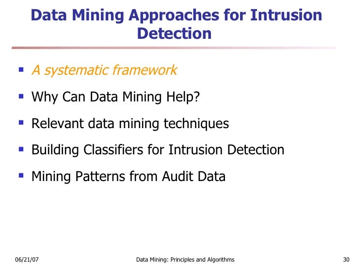 Data Mining And Intrusion Detection Ppt Download. Misuse detection and anomaly detection. Data mining for network intrusion detection: Handling the analysis of data due to its adaptability and validity, it is now used extensively within network security13. Intrusion detection system using data mining technique: In misuse detection, each instance in a data set is labeled as 'normal' or 'intrusion' and a learning algorithm is trained over the labeled data. This chapter gives a critical account of the past five years of data. When doing data mining for intrusion detection one could use data at the level of tcpdump lee and stolfo, 1998 or at the alarm level [manganaris, et al. Support vector machine free download a review of intrusion detection technique by soft computing and data mining approach free download a shrivastava, m baghel, h gupta ,theaccents.org abstract the. Machine learning, data mining holds a very significant position. However, intrusion detection is not yet a perfect technology (lippmann et al., 2000;