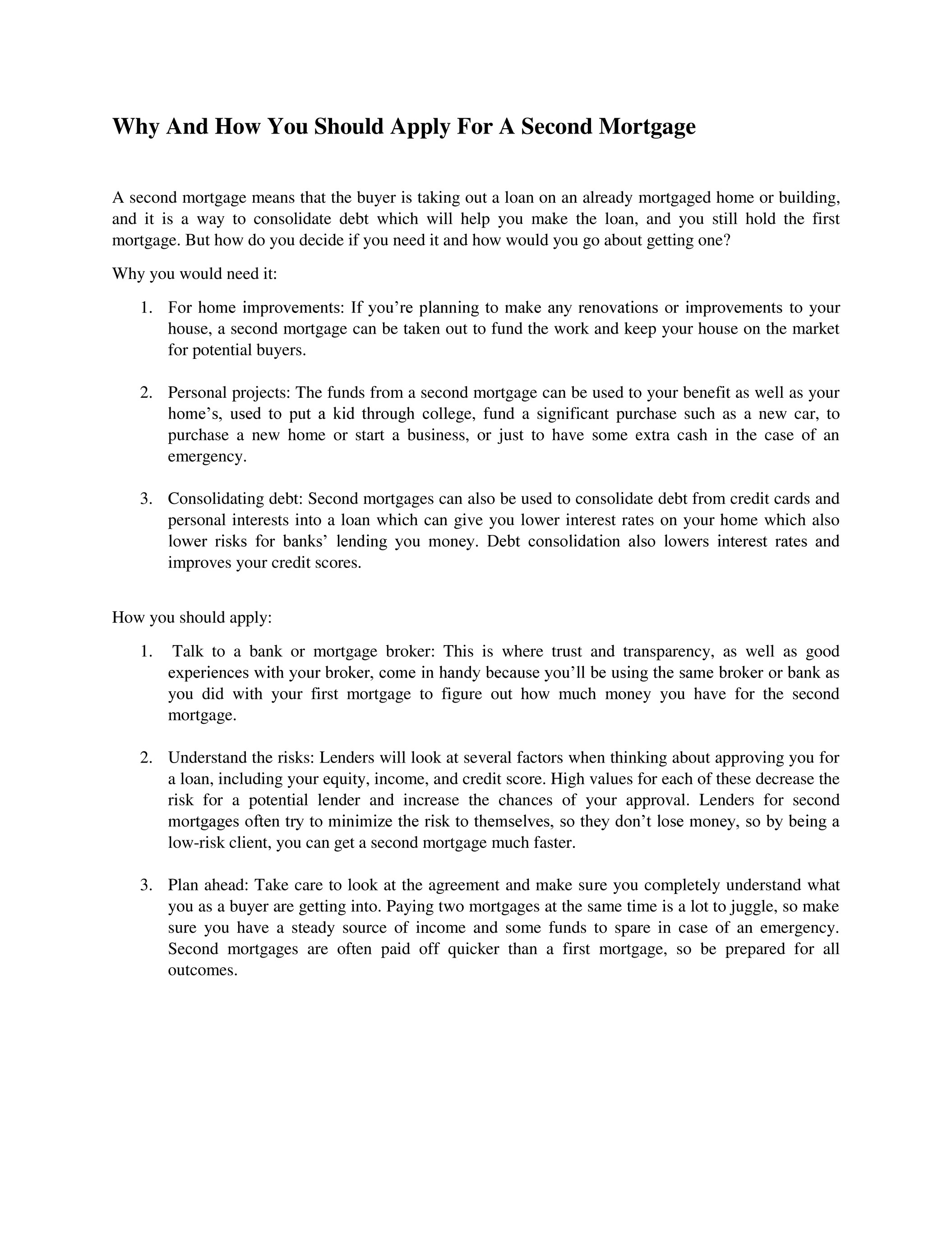 Arrange Quick Funds Through Second Mortgage Loans : There can be various reasons to take out a second mortgage, such as consolidating before agreeing to the loan, always get how much the fee is in writing.