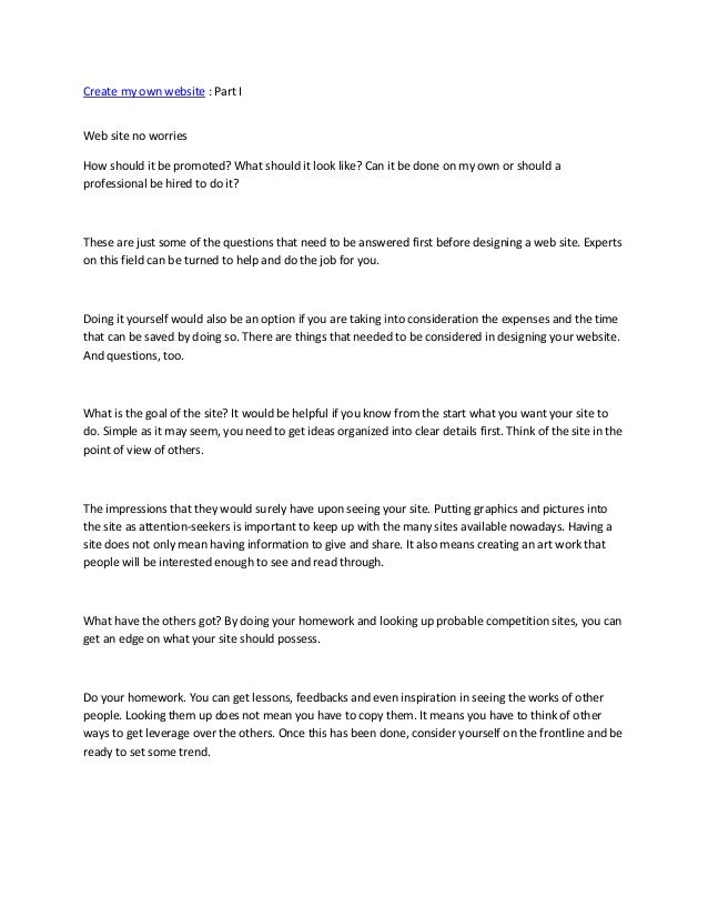 How To Create A Website Webself Your Free Website. Who will build it for me? Making your own website lets you share your ideas, build a brand and grow your business. Creating a website can be done in many ways. This comprehensive guide takes you through each step, from set up, to publishing, to managing your own website. Alternatively, you can use programs such as frontpage and macromedia dreamweaver to create your website. Whether it's to share your expertise on a particular topic, start an online business, foster a community, or just how much would it cost me to own such a website with my own web address and html? The next two steps on. This is the easiest method of building a website. Many web hosting providers provide website building tools and software. Now, to create a new page, you can use 2 methods: This site contains different tutorials on how to build a website using wordpress, joomla, drupal whether you want to create a website for yourself or for your business, you can easily do that by congrats, you've just figured out how to create a website all on your own! This site teaches you how to make a website in just 3 easy to follow steps. Creating your own website can be useful for a number of purposes. Learn how to make a website in 2020. 1) create your own page by dragging and dropping elements using elementor.