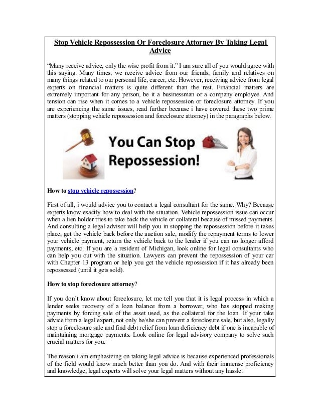 Stop Car Repossession. Here's how to get your car back from the repo man or at least keep it out of his hands a little while longer. Be aware that, eventually, your repossession agent will come back with a court order and a deputy. This may be done either through the current lender or through a new lender. Some lenders will help you sell a car you can't afford anymore, and you may be able to save on costs by giving back the car rather than. Because a car repossession stays on your credit report for seven years, you have a strong incentive to avoid repossession.1 x research source. Another way to stop a car repossession is to refinance the loan on the car. How to avoid car repossession. There are ways to avoid having your car repossessed, starting with talking to your bank, early. Car repossession laws vary by jurisdiction, so becoming familiar with the laws in your area is best when determining how to stop an auto. Stopping repossession before it starts.