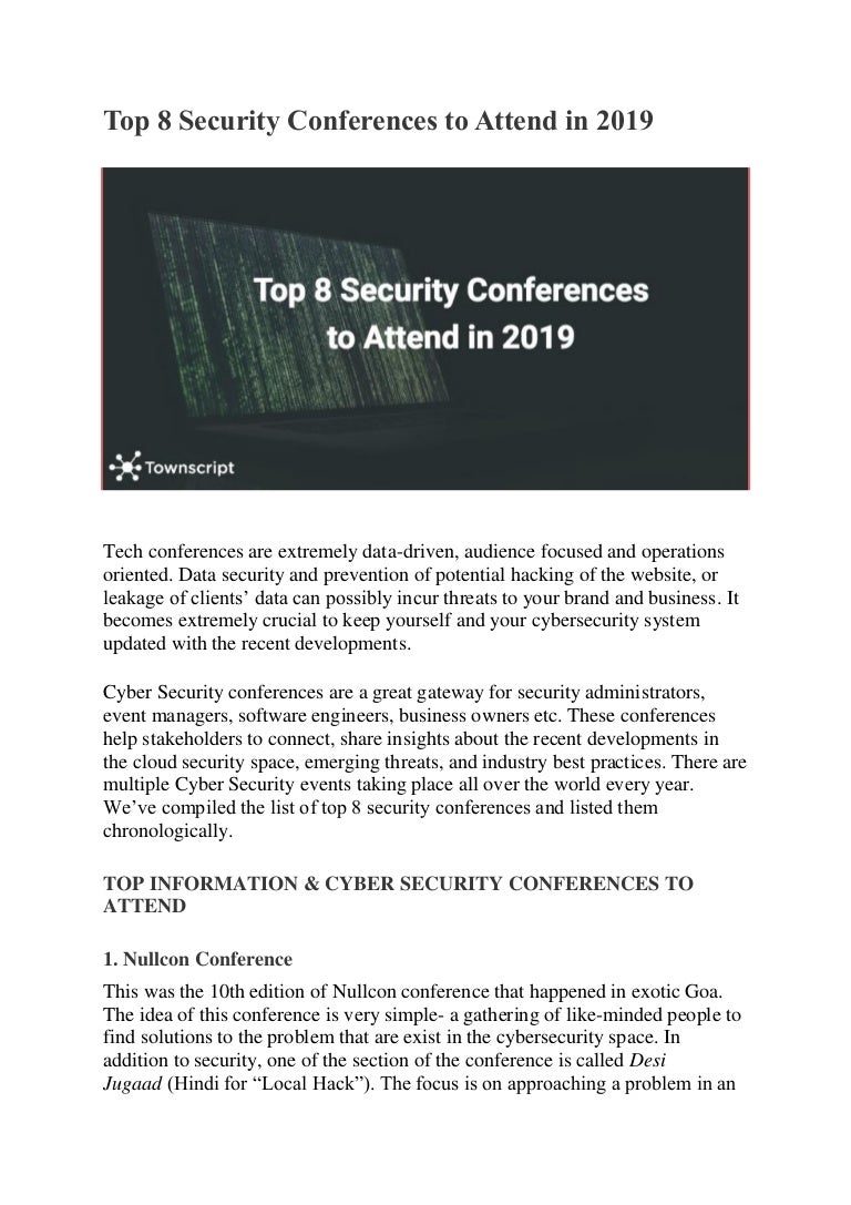 Top 10 Information Security Conferences Security Conference Security Conference , Post a cfp for 2020 or later | invite the organizers.