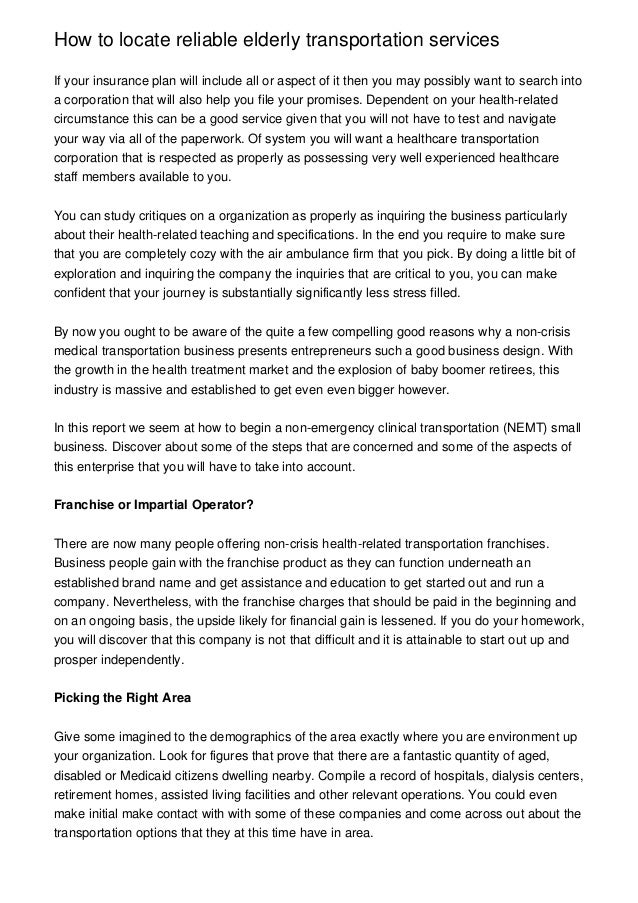 Business plan template and example: By shailendra sinhasane in blog posted december 20, 2018. S = signs/symptoms a = allergies m = medications p = past medical history l = last meal e = events leading up to the emergency. As long as you know that from the outset and are willing to put. This site is intended to assist in understanding the connecticut's nemt program. Non emergency medical transportationservices includes medical transportation,transport for elderly, physically challengedpeople requiring transit, hospital this nonemergency transportation service is kind ofa taxi service to those who are notphysically capable of moving and to elderlypeople. This offers the least expensive transport services as a large percentage of americans. Each of our non emergency medical transportation insurance clients is assigned an agent in our office and provided their email address along with a phone number that rings workers compensation insurance is another important consideration for non emergency medical transportation businesses. Business plan template and example: Emergency transportation benefits are covered to the first hospital which accepts transportation services that are available to l.a. Doctors schedule transportation for patients who have a medical condition that prohibits them from travel. Care cal mediconnect members include More and more people need to go for hospital visits or check ups and getting a cab is not always flexible. Make sure to make an appointment at least two business days in advance and check that it is covered by mainecare and. Law firms depend on these. We are a non emergency medical transportation broker, specializing in affordable, safe and professional transportation. How to write a business plan: Further, you will transport people who need some type planning your business. You'll need to research your competitors, for a. This segment of people including healthcare seekers and accompanying individuals make for a potential business opportunity for the transport industry. These transportation services have been. Begin with a medical transportation business plan. Any person looking to start a medical transportation business should do well as long as he follows certain steps. Transportation services (nonemergency) health care authority (hca) covers nonemergency medical transportation for eligible clients to and from covered services through contracted brokers. Those that come from the patients (or the like any other business, starting a medical transportation company is hard work. Non emergency medical transportation transportation services health professional home health ems words business emergency medicine business illustration. The brokers arrange and pay for trips for qualifying clients. Currently, eligible clients are those in. • medical needs are immediate • symptoms are severe • symptoms may be • states • brokers • managed care plans • transportation companies. Do you have plans on starting a nonemergency medical transportation business? United medical transportation providers group.