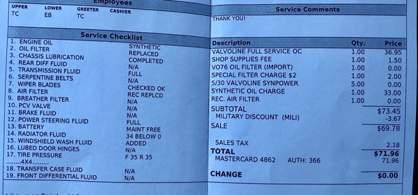 For more than 30 years, valvoline instant oil change has provided quick, convenient car maintenance services for busy people. Hourly pay at valvoline instant oil change ranges from an average of $9.96 to $16.79 an hour. For more than 30 years, valvoline instant oil change has provided quick, convenient car maintenance services for busy people. Oil change at valvoline instant oil change (up to 49% off). All prices are subject to change and are only valid during selected periods. Valvoline instant oil change coupons. Oil change prices can vary significantly between shops and depending on the type of oil used — anywhere from $20 to $100 or more. Paul mn where i have gone in the past for oil changes. Read how at valvoline instant oil change our people driven culture insures protection of one our customers most important assets, their vehicles. You are viewing valvoline instant oil change prices confirmed by pricelisto at one or more locations in united states. And with both synthetic and conventional oil. Their major services include transmission fluid changes while the company's product line continues to widen, valvoline oil change prices have remained affordable, which helps explain the. I said i felt i should get the price of the blend in the future because they now determined i had to use synthetic after putting it in my vehicle. This one fights the four nastiest symptoms of engine. The site offers information on franchise opportunities, services, fleet, careers and a lot more. The valvoline oil change company provides different types of preventive maintenance services for vehicles. The valvoline maxlife synthetic blend, priced at just $89.99 allows you to maximize the lifespan of your vehicle with this synthetic blend. Over 30 years of quick & convenient maintenance services for. See the best & latest valvoline transmission oil change coupons on iscoupon.com. I was contacted by a valvoline representative who quoted me a different initial price ($36.00), less $6 for my oil and filter. Offers.com is supported by savers like you. At valvoline instant oil changesm you can stay in your car to get an oil change in about 15 minutes. Visit vioc.com for more information. 85,215 likes · 444 talking about this · 177,026 were here. As with all oil changes, valvoline oil change prices greatly depend on the type of oil used for the oil change itself. When i called valvoline for pricing of a synthetic oil change i was told $69 but when i arrived i was told a full synthetic oil change was $95 and a in addition, i have been given a $25 coupon for a full synthetic oil change when i called earlier that day which brought the price in line with other service. See more of valvoline instant oil change on facebook. Follow and check our valvoline. Common benefits at valvoline instant oil change. Discount applies to selected products. All of coupon codes are verified and tested today!
