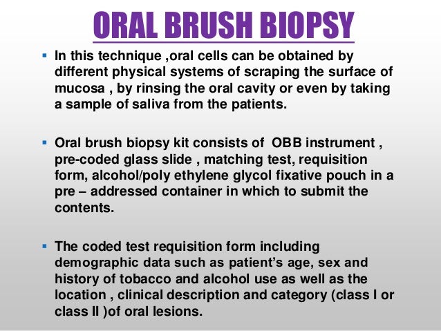 Brush Biopsy Early Oral Cancer Detection Using Brush Biopsy Or Oral Cdx Oral Cancer Screening. Oral brush biopsies were routinely used for cytological examination of the oral mucosa in the last decade 1 , 2 , 3 , 4 . Cytopathologic evaluation of oral brush biopsies from leukoplakias and erythroplakias as a single method 5, 20 documented 91,3% and 94,6% sensitivity of oral brush biopsy and maraki et al. Oral surg oral med oral pathol oral radiol. It was the recipient of american dental association (ada) seal of acceptance in 2000. • ccomponents t of fkit kits: Oral brush biopsy is a painless, easy to perform, chair side procedure that can be used to evaluate any lesion with suspicion of malignancy. The main advantages of oral brush cytology are: Painless test used to help prevent oral cancer. Tissue biopsy is the gold standard for diagnosing disease. Oral health and dental management, research and reports.