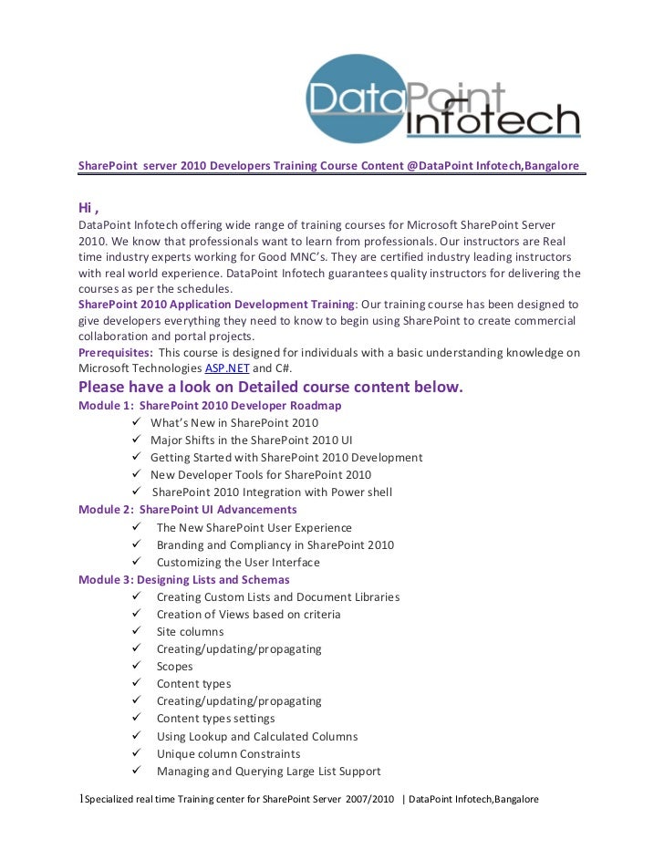 Sharepoint Developer Resume Sample Mintresume. Every sharepoint undertaking will at one point face the following questions: To use the guidance properly, youll need to have sharepoint server 2010 and visual studio 2010 installed on a windows operating system. I much prefer to learn by doing, rather than reading about doing. Get my 3 hour course on introduction to microsoft sharepoint 2013. Here's a suggestion of the best sharepoint 2010 books out there. Download individual training presentations from this page. Building solutions for sharepoint 2010. This developer kit will provides developers with deep guidance on how to develop for sharepoint 2010. How long will it take, how much will it cost to implement, and how will we use it? Books remain the most important resource for learning a new topic. Sharepoint training,sharepoint 2010 training,sharepoint 2010 developer training,sharepoint 2010 administration training,best sharepoint training,sharepoint 2010 training in bangalore,best sharepoint 2010 sharepoint 2013 developer training objectives. Formal training is not always the best solution for everyone. Click here to get the free course ►. You can download sharepoint 2010 developer training kit which is 107.68 mb in size and belongs to the software category sdk ddk. All students will learn to