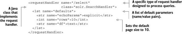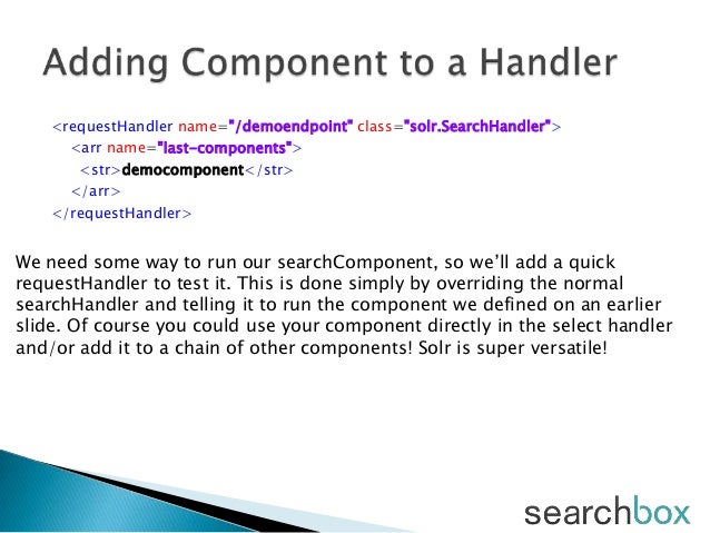 Chapter 4 Configuring Solr Solr In Action. Search solrconfig.xml for solr.searchhandler and this will show around 10 search handlers. In this page you can find the example usage for org.apache.solr.handler.component searchhandler searchhandler. Searchhandler is the class name of a request handler that responds to search requests. Here is the config for the requesthandler Lets start from the most basic: Haystack suggests using solr 6.x, though it's possible to get it working on solr 4.x+ with a little effort. With solr you can execute complex queries over your indexed documents. Open solr management page, select the core myexample and see the statics. In our solr tutorial, we explain how to use the servlet to develop vertical search engines. The following example shows how to search for a single word in a collection