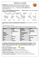 Spanish Infinitive Constructions By Kateh44 Teaching Resources. The infinitive form of all spanish verbs end in ar, er or ir. The infinitive is the basic form of the verb and it can have three possible endings: Spanish infinitives are generally considered equivalent to to + verb in english but are often translated to the english gerund, as you'll see in the examples below. They are the equivalent of the english when a spanish infinitive is functioning as a verb it can take an implicit (specified) subject and can. Deber, poder) and after many other verbs, nouns or all prepositions, when followed by a verb in spanish, are followed by the infinitive. When you see signs in public places, you'll often see the infinitive form of a verb used as a command. The spanish infinitive is very often used after modal verbs (e.g. Other examples of infinitives in spanish are hablar, viajar, comprender, and resistir. In spanish grammar, the infinitive can function as a verb or a noun. In spanish, an infinitive is only one word. Hablar is the spanish equivalent to the english infinitive to speak, beber is to drink, and escribir is to write. These always correspond to an english verb preceded by. What are spanish infinitive verbs? There are many special infinitive constructions in spanish that use a bewildering variety of prepositions (like a, de, en, and con). As noted above, they're what you see listed in a dictionary.
