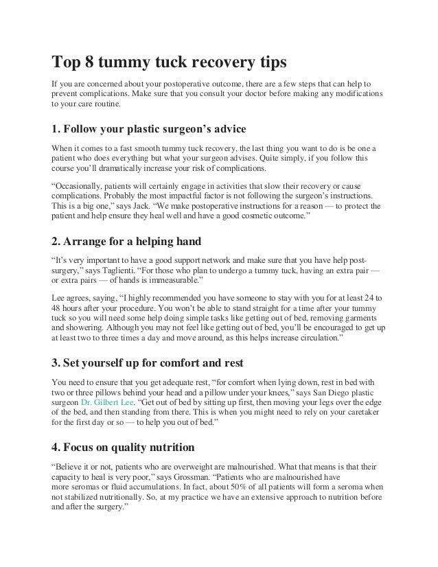 Best Tips For A Comfortable Tummy Tuck Recovery. Considering a tummy tuck procedure but you're concerned about the recovery time and potential complications? When deciding whether to have a tummy tuck, it is important to consider how long it will. There is both a financial investment as well as a time investment in the recovery process. Below is my list of ten best tummy tuck recovery tips that i have learned from my own patients that have been through the process and have come up. Tips for a speedy tummy tuck recovery. Undergoing a tummy tuck can be a daunting decision to make. — written by jenna fletcher on february 20, 2020. Your fears may be based more in fiction than fact. A tummy tuck is considered major surgery so there will be issues involving pain, swelling and bruising that may take several weeks to resolve. Learn the top tummy tuck recovery tips, including how long it takes to heal, how much swelling to expect, and more.